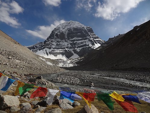| Unter den zahlreichen heiligen Bergen Tibets nimmt der Kailash eine besondere Stellung ein, da sich seine spirituelle Bedeutung nicht nur auf den tibetischen Kulturraum beschränkt. Der Kailash wird nämlich von Anhängern vier unterschiedlicher Religions- gemeinschaften Asiens - Hindus, Jainas, Buddhisten und Bönpos, den Anhängern der vorbuddhistischen Religion Tibets als heilig betrachtet und ist seit mehr als 1000 Jahren Ziel ihrer Pilgerschaften. |